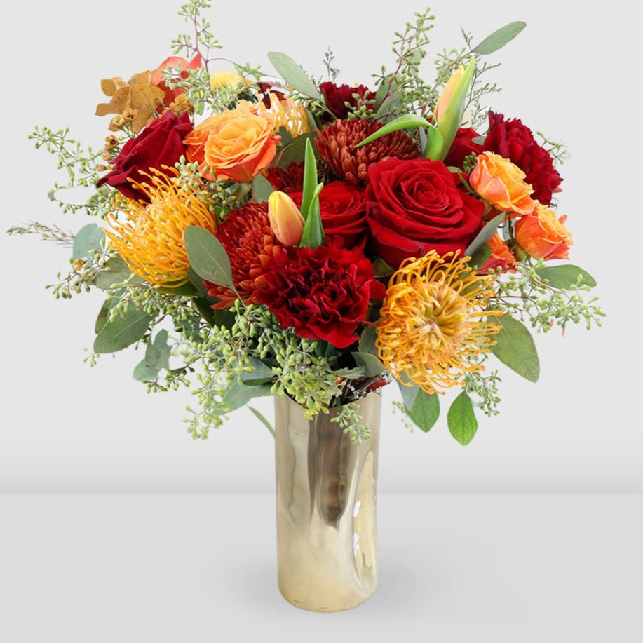 This bouquet includes Freedom Roses, Tulips, Orange Spray Roses, Spider Mums, and Pincushion Protea with Seeded Eucalyptus greeneries. 15" clipped, 17" w/ vase.