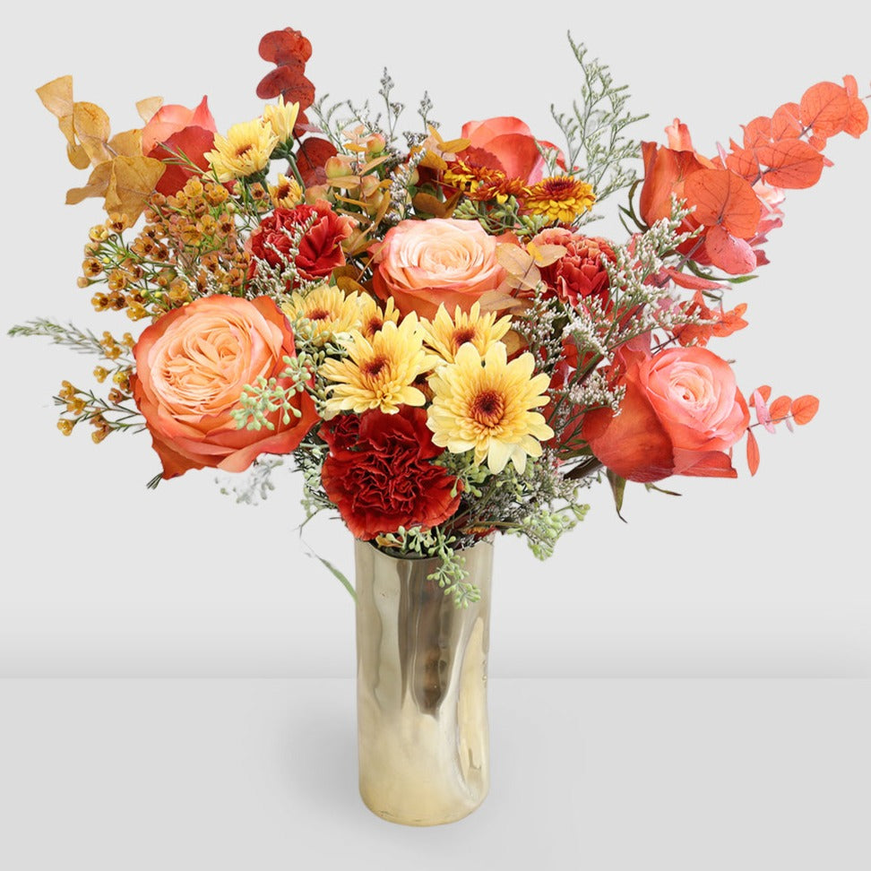 The perfect addition to the holiday dinner table. Bring family together this holiday season with this fine bouquet of autumn colors. Let this fall masterpiece be the center of attention at your dinner table this year. It will blend right in without going unnoticed and is sure to be the finishing touch to your family gathering.