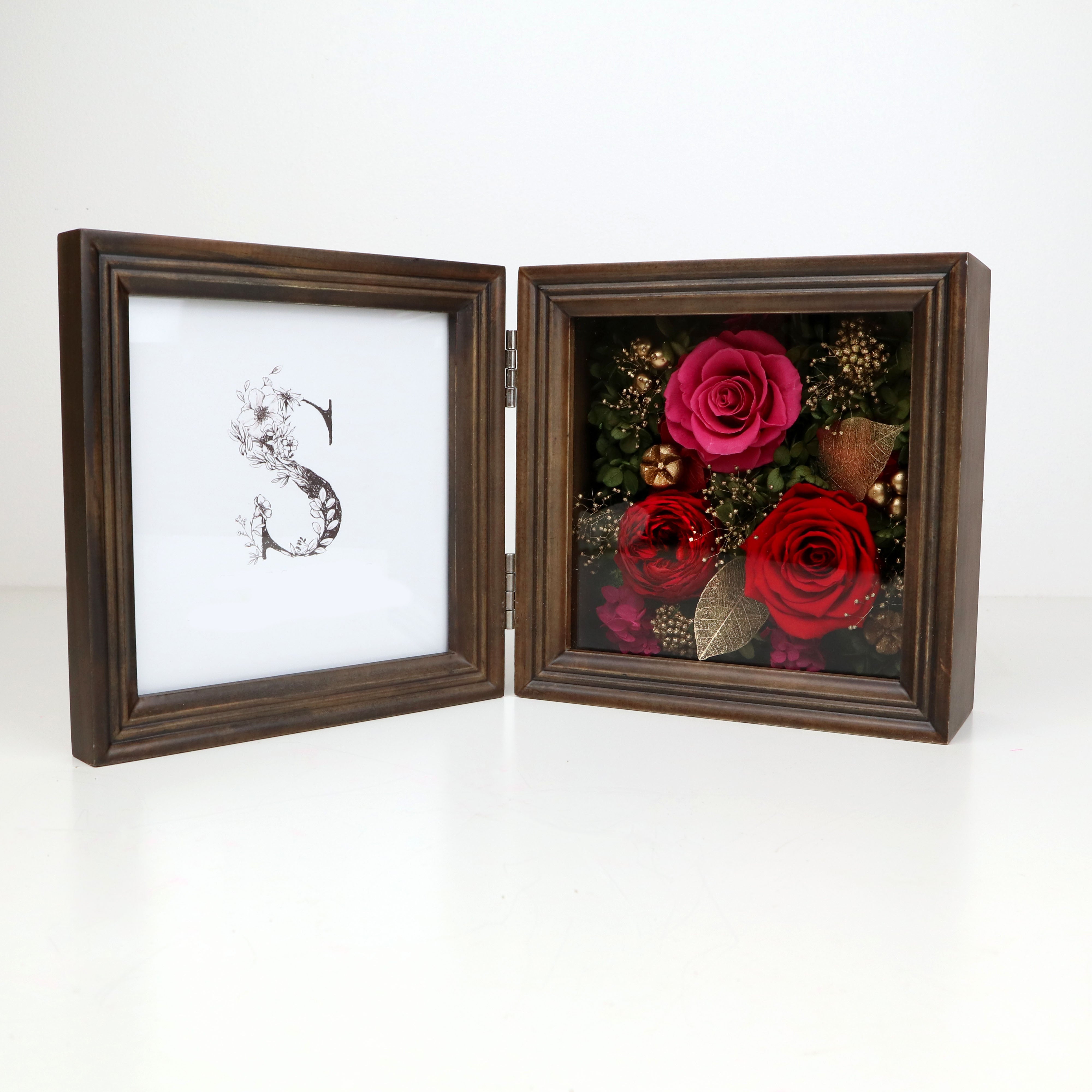 The Forever Photo Frame I is a photo frame of preserved flowers. This frame consists of red and pink hues, dark green foliage, and gold glittery accents.