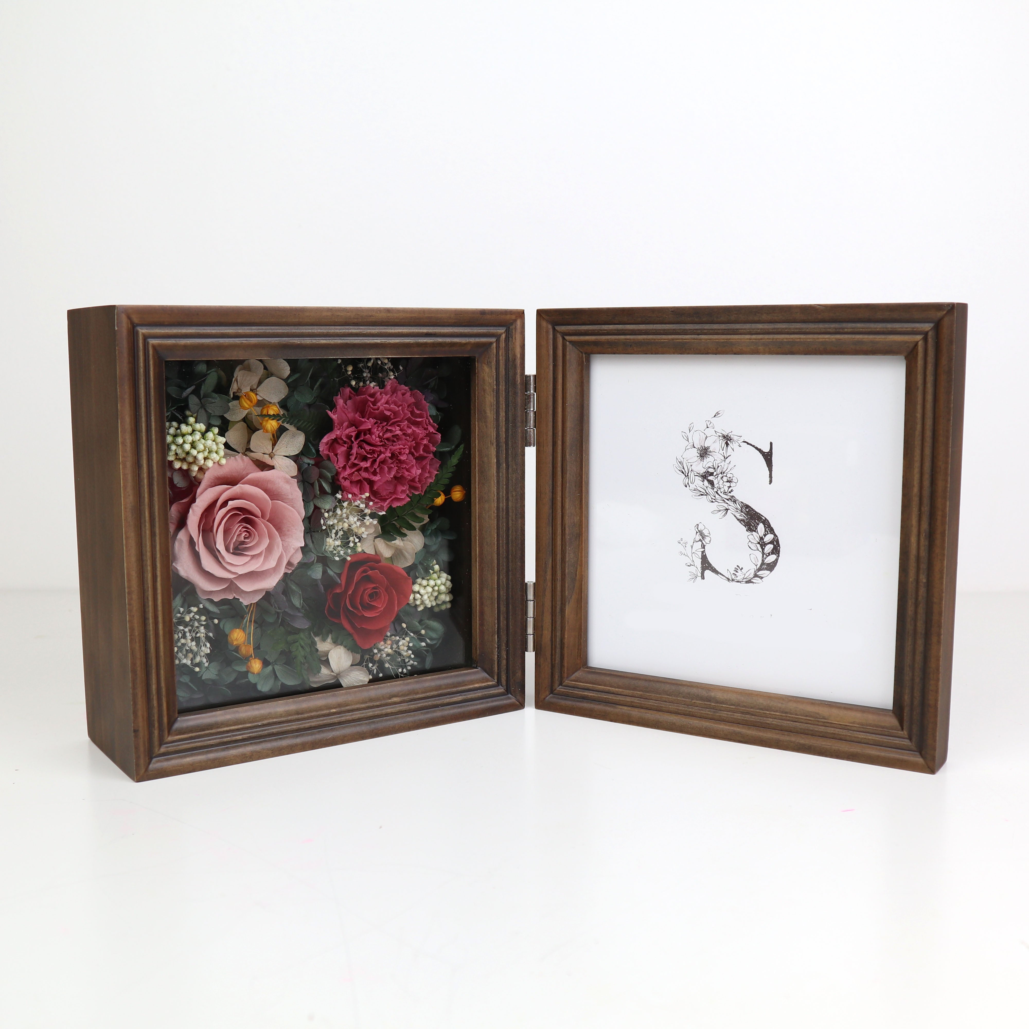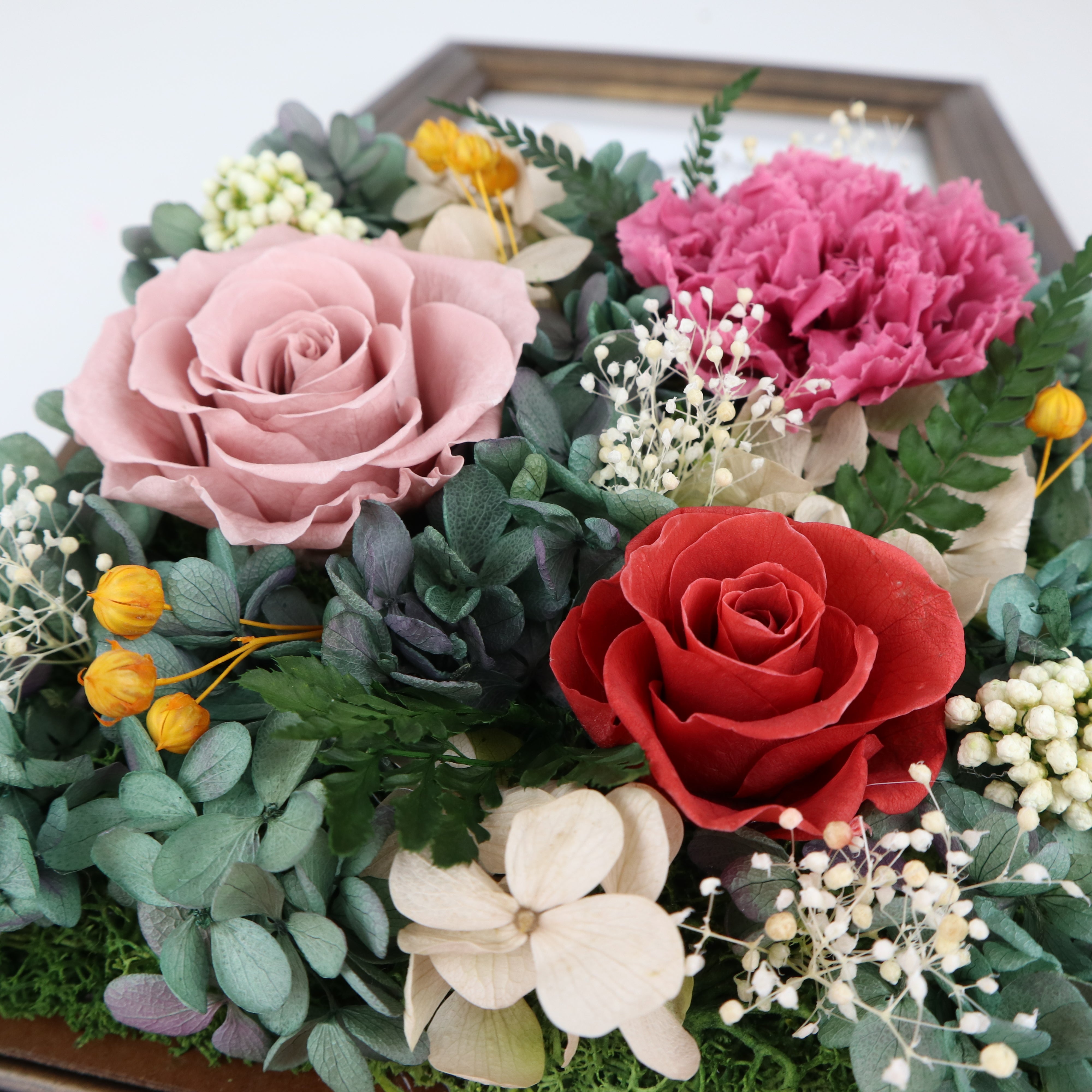 Enhance your Message with a Flower Frame. Spruce up your message with this photo frame that features preserved flowers that showcase a palette of red, pink, and mauve hues with dark green foliage and orange accents. This is a great way to ensure your message stands out and makes a lasting impression.