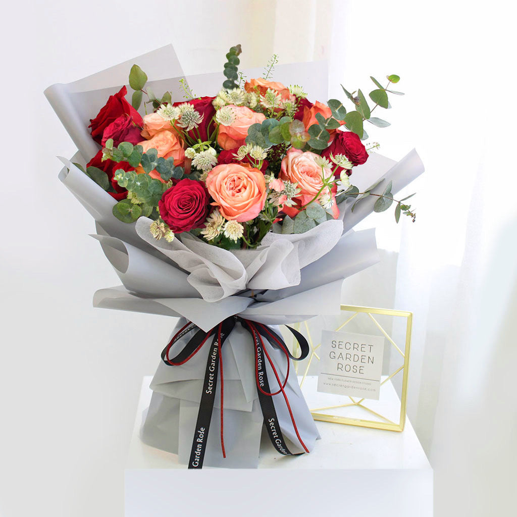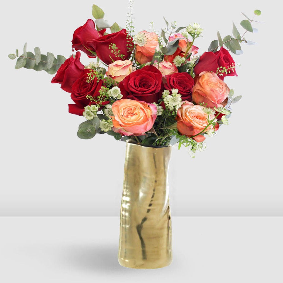 Romance in physical form. This combination of red and kahala roses is sure to be a showstopper and one to set the mood for a romantic evening. This cunning gift sends a warm message with clear intentions but offered in style and tact. This bundle is perfect for special occasions.