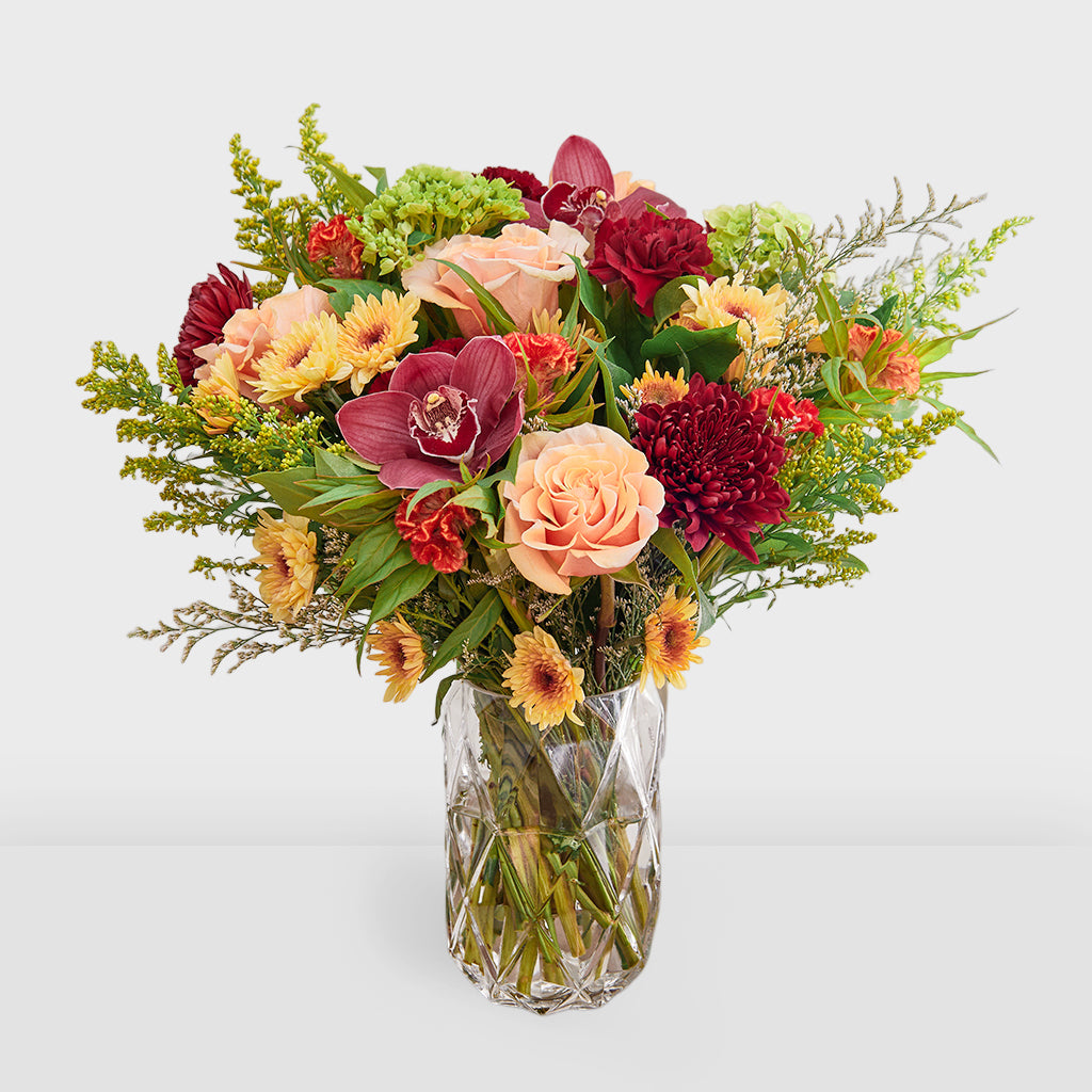 This beautiful flower bundle includes Green Hydrangeas, Phoenix Roses, Cymbidiums, Celosia, Burgundy Mums, Pompoms, Solidago, and Red Carnations with Lemon Leaves greeneries. 15'' clipped, 17'' w/ vase.