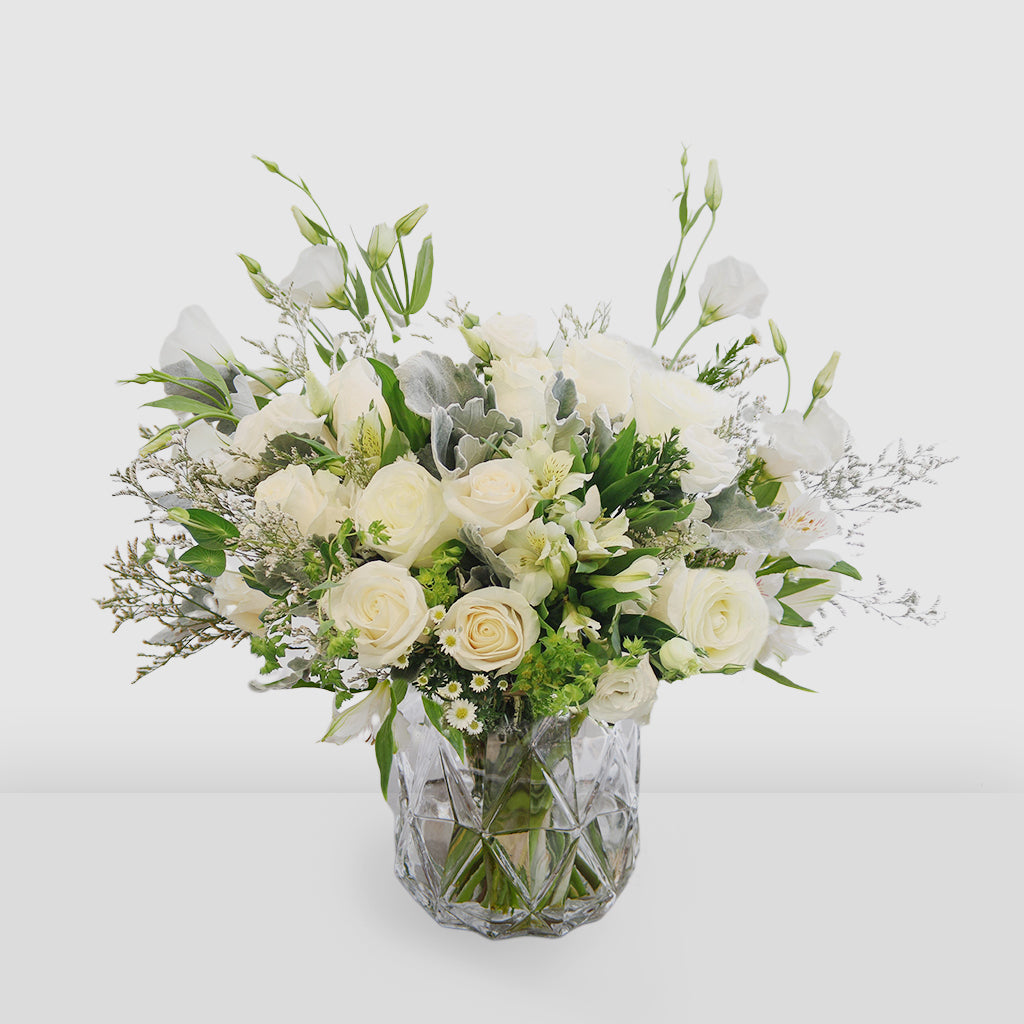 This bundle includes Vendela Roses, Alstroemeria Whistler, Caspia, White Lisianthus, White Aster, and Bupleurum with Dusty Miller greeneries. 15" clipped, 17" w/ vase.